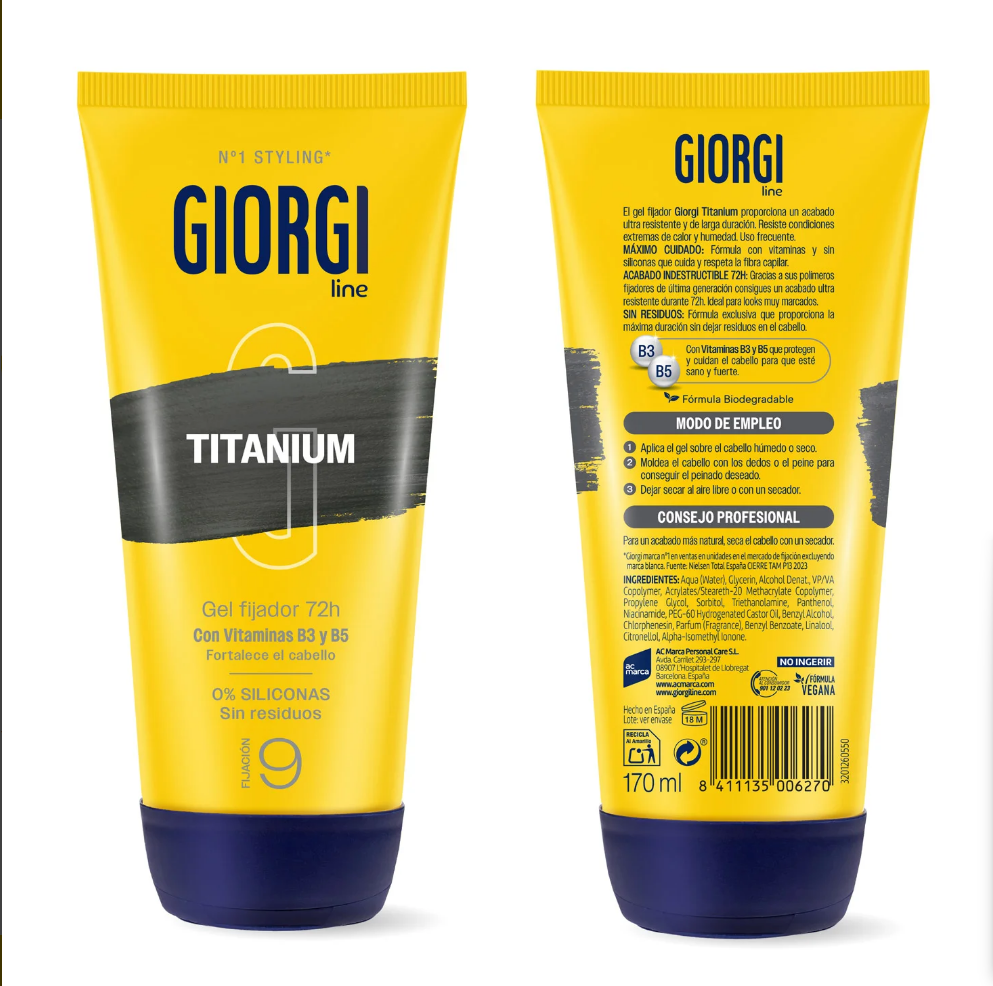 Gel Giorgi Fijación Titanium 240 ml, máxima fijación y brillo sin residuos. Peinados duraderos y definidos.
