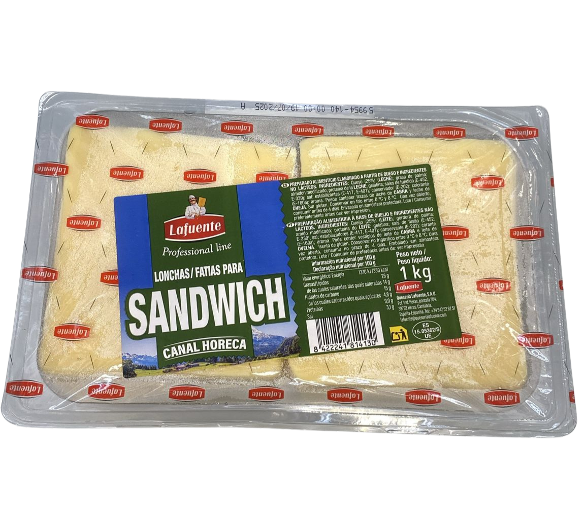 Lonchas Sándwich Horeca La Fuente 1kg. Queso suave ya cortado en lonchas, ideal para sándwiches, bocadillos y cocina profesional.
